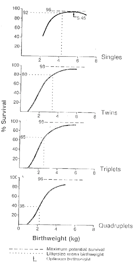 The importance of protein supplementation was further tested in a large scale trial (2 years) on 200 Border Leicester Merino ewes carrying 1,2,3 lambs (Hinch et al. 1996). Supplementation in mid and late pregnancy (80-120 g/h/d of cotton seed pellets) resulted in no significant differences in birth weights but did significantly improve survival of lambs from all litter sizes (Figure 4) implying that mechanisms other than just birth weight are important. The protein supplementation in this experiment had minimal effects on wool characteristics (weight and strength).